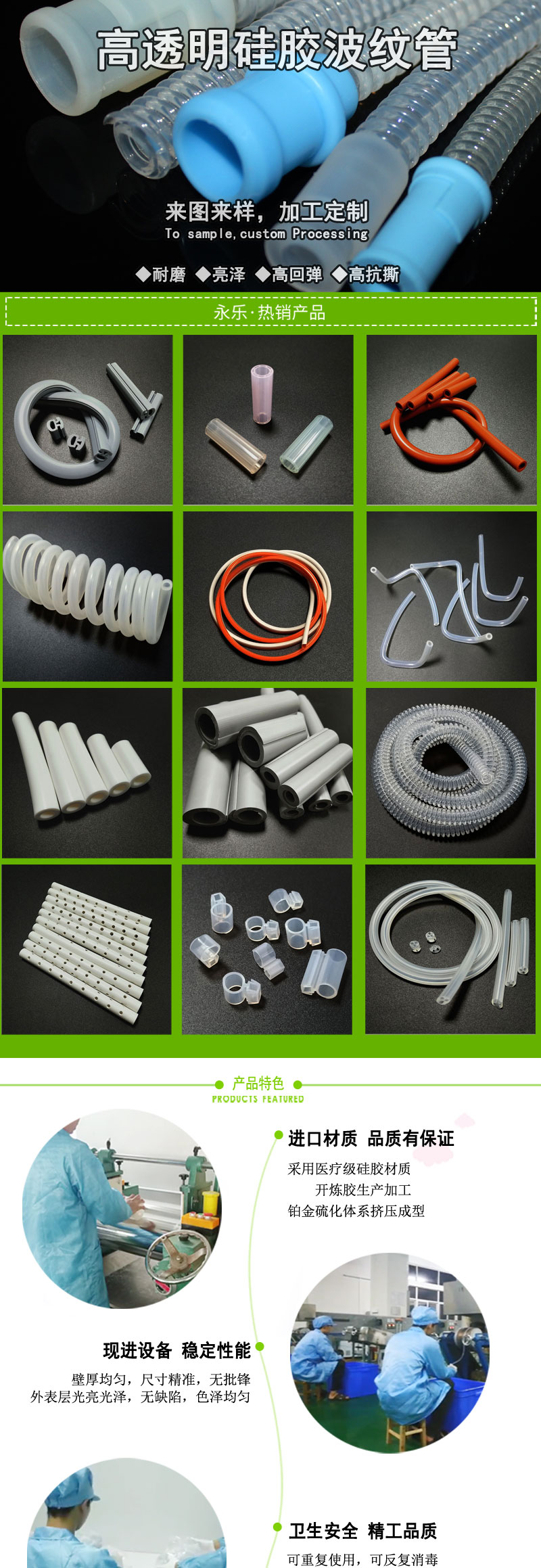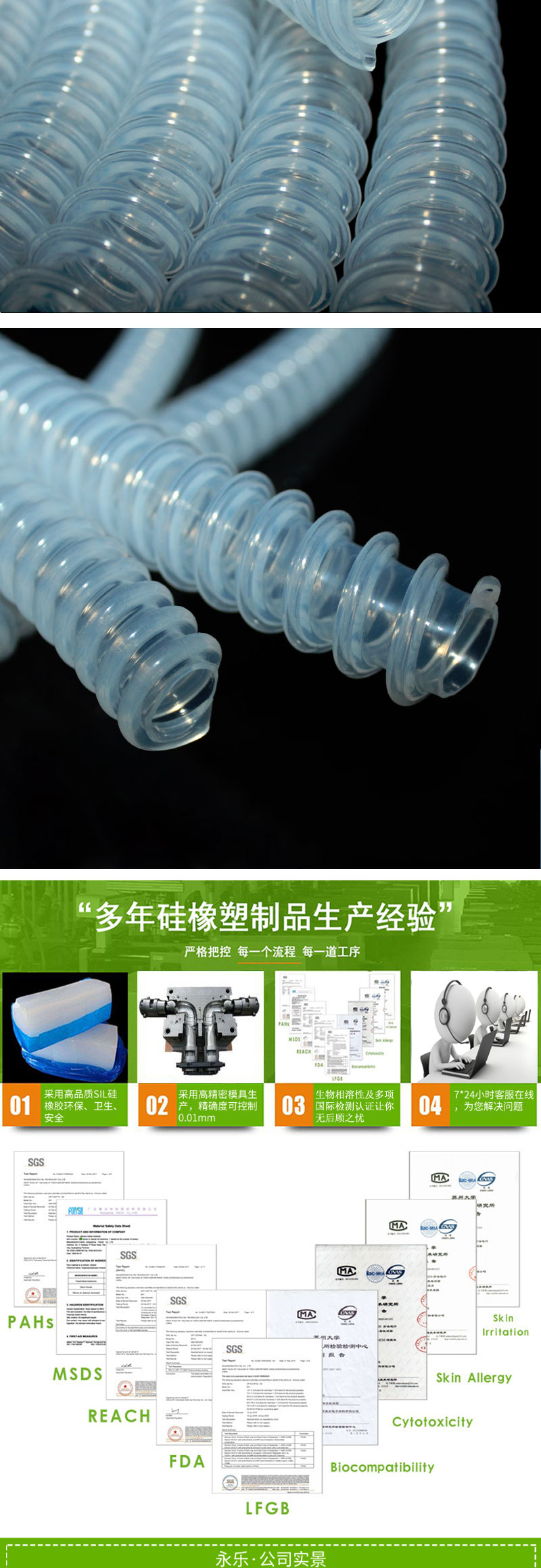 高透硅膠波紋管:采用進(jìn)口硅膠原材料,連續(xù)擠出一次成型,內(nèi)壁平滑;常規(guī)硬度60度(邵氏硬度30-90度);耐溫范圍廣(-50~+280℃),可以適應(yīng)高、低溫設(shè)備需求,并耐老化。常規(guī)PE袋+紙箱包裝,特殊要求可按客戶標(biāo)準(zhǔn);產(chǎn)品符合SGS、FDA、LFGB、生物相溶性等;用于呼吸機(jī)、麻醉機(jī)、制氧機(jī)、輸氧機(jī)管道等。