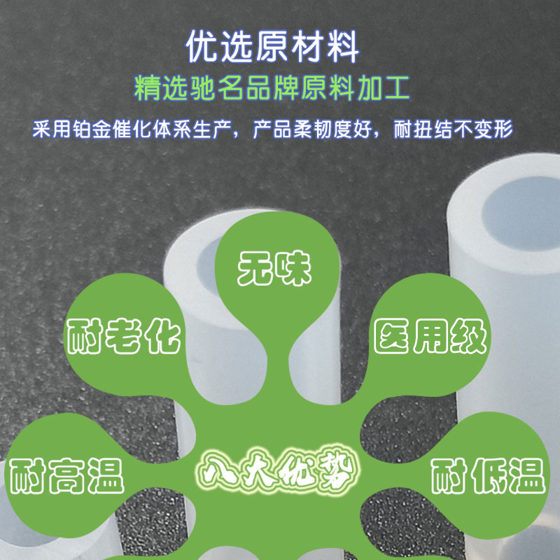 鉑金氣腹機(jī)硅膠管:采用進(jìn)口硅膠原材料,連續(xù)擠出一次成型,內(nèi)壁平滑;常規(guī)硬度60度(邵氏硬度30-90度);耐溫范圍廣(-50~+280℃),可以適應(yīng)高、低溫設(shè)備需求,并耐老化。常規(guī)PE袋+紙箱包裝,特殊要求可按客戶標(biāo)準(zhǔn);產(chǎn)品符合SGS、FDA、LFGB、生物相溶性等;用于呼吸機(jī)、麻醉機(jī)、制氧機(jī)、輸氧機(jī)管道等。