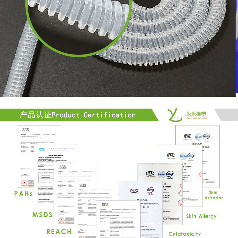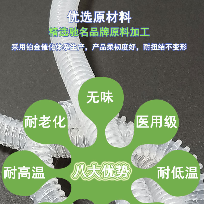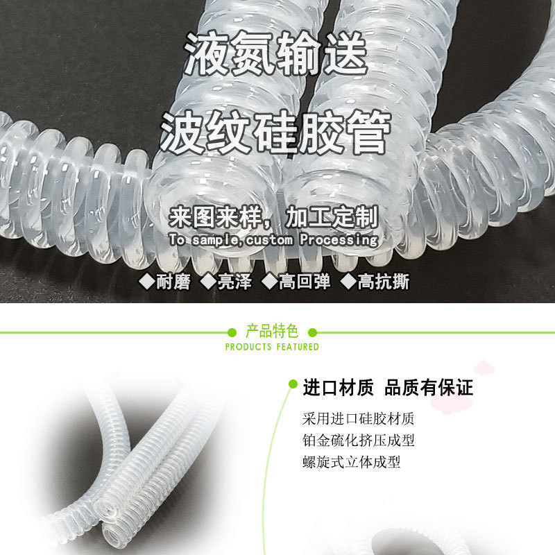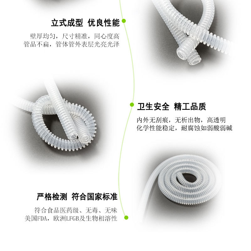 液氮輸送波紋硅膠管:采用進(jìn)口硅膠原材料,連續(xù)擠出一次成型,內(nèi)壁平滑;常規(guī)硬度70度(邵氏硬度30-80度);耐溫范圍廣(-50~+280℃),可以適應(yīng)高、低溫設(shè)備需求,并耐老化。常規(guī)PE袋+紙箱包裝,特殊要求可按客戶標(biāo)準(zhǔn);產(chǎn)品符合SGS、FDA、LFGB、生物相溶性等;用于呼吸機、麻醉機、制氧機、液氮輸送管道等。