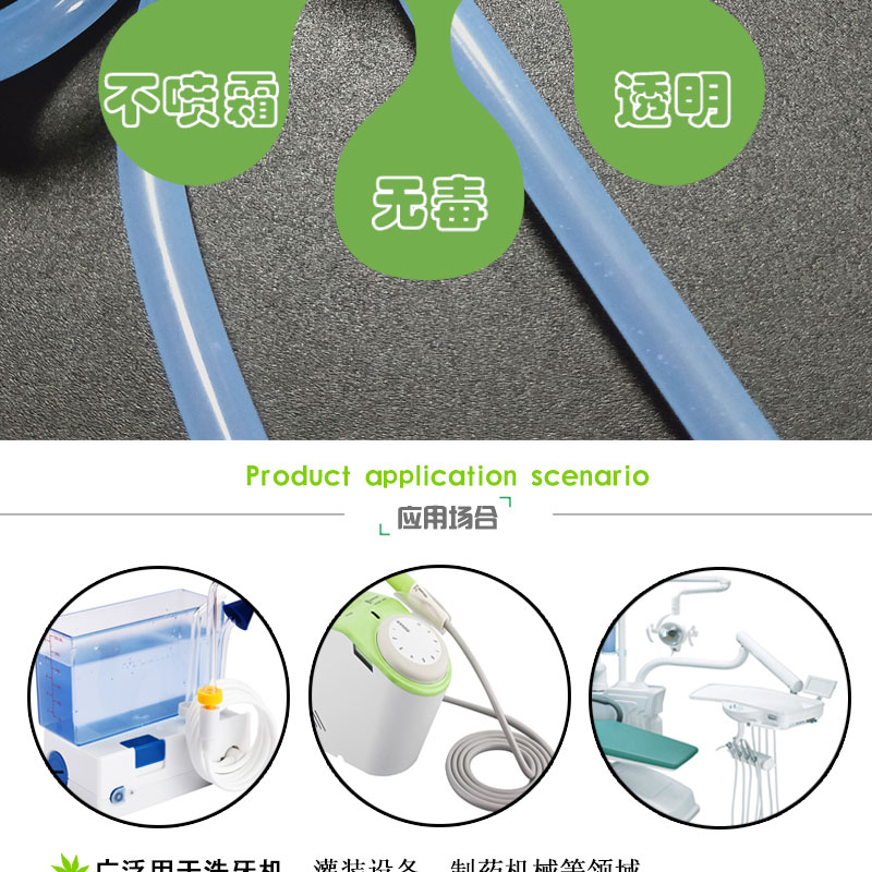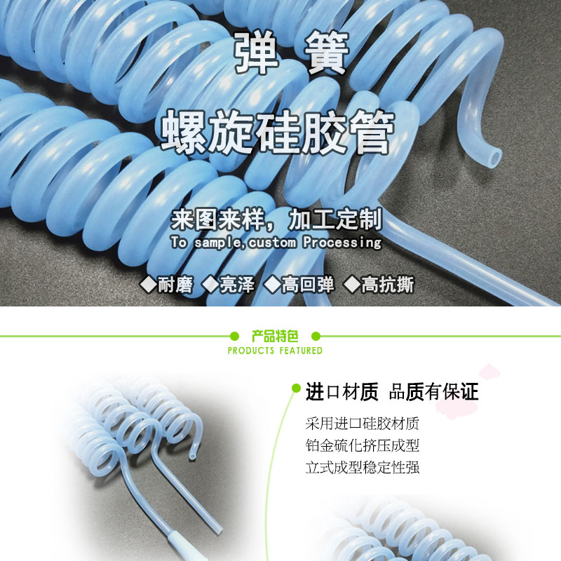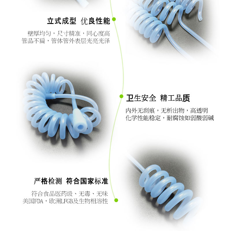 彈簧拉伸式硅膠管: 采用特種硅膠原材料,連續(xù)擠出成型,內(nèi)壁平滑;常規(guī)硬度70度(邵氏硬度30-80度);耐溫范圍廣(-50~+280℃),可以適應(yīng)高低溫設(shè)備需求,并耐老化。常規(guī)PE袋+紙箱包裝,特殊要求可按客戶標(biāo)準(zhǔn);產(chǎn)品符合SGS、FDA、LFGB、生物相溶性等;用于醫(yī)療激光洗牙機(jī),醫(yī)用設(shè)備、呼吸傳送等設(shè)備。