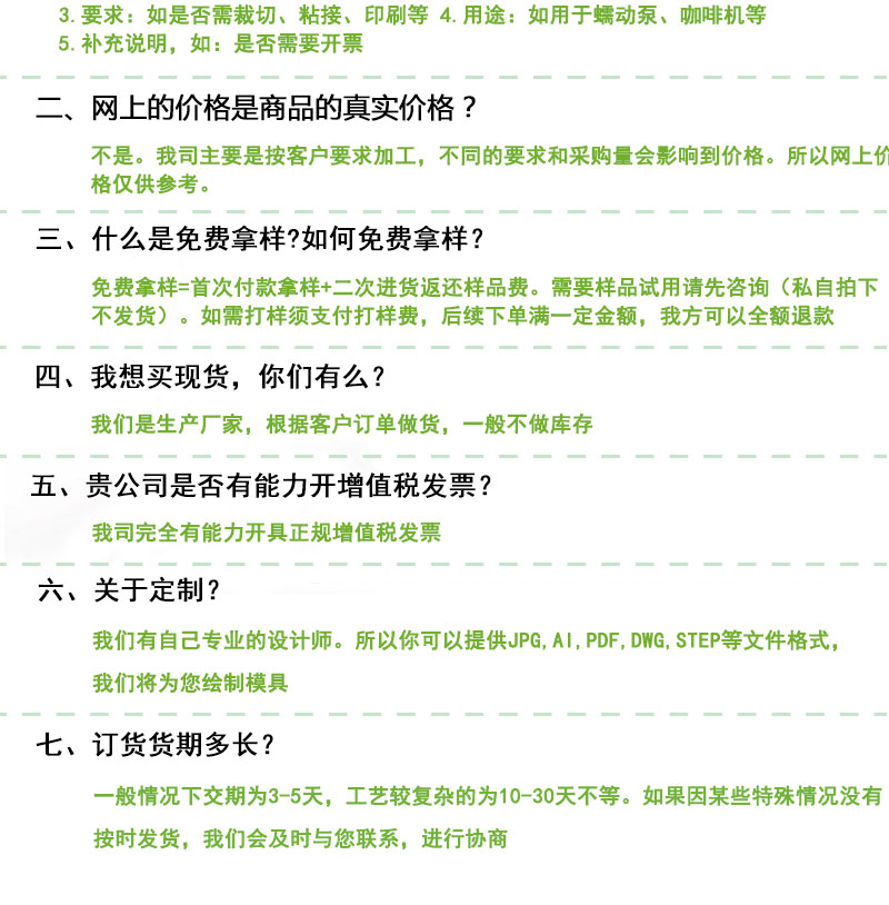 產(chǎn)品硬度 | 打樣時間 | 7天內(nèi) | 產(chǎn)品樣板 | 現(xiàn)樣免費 | |