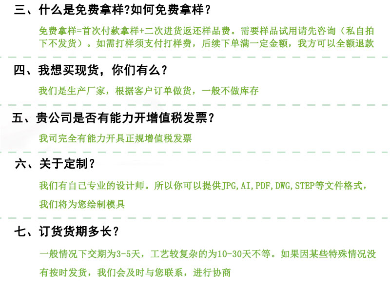 產(chǎn)品硬度 | 打樣時間 | 7天內(nèi) | 產(chǎn)品樣板 | 現(xiàn)樣免費 | |