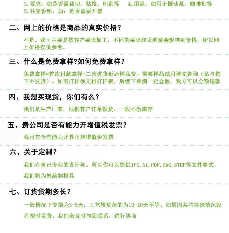 產(chǎn)品硬度 | 20-80A | 打樣時間 | 7天內(nèi) | 產(chǎn)品樣板 | 現(xiàn)樣免費 |