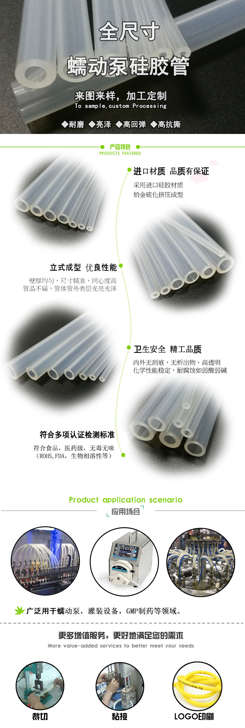 全尺寸蠕動泵硅膠管:采用進口硅膠原材料,立式成型,鉑金硫化,內壁平滑;常規(guī)硬度60度(邵氏硬度值30-90度);耐溫范圍廣(-50~+280℃),可以適應高低溫設備需求,并耐老化。常規(guī)PE袋+紙箱包裝,特殊要求可按客戶標準;產品符合SGS、FDA、LFGB、生物相溶性等;用于灌裝機、蠕動泵專用、醫(yī)療醫(yī)用器械、輸液泵等。