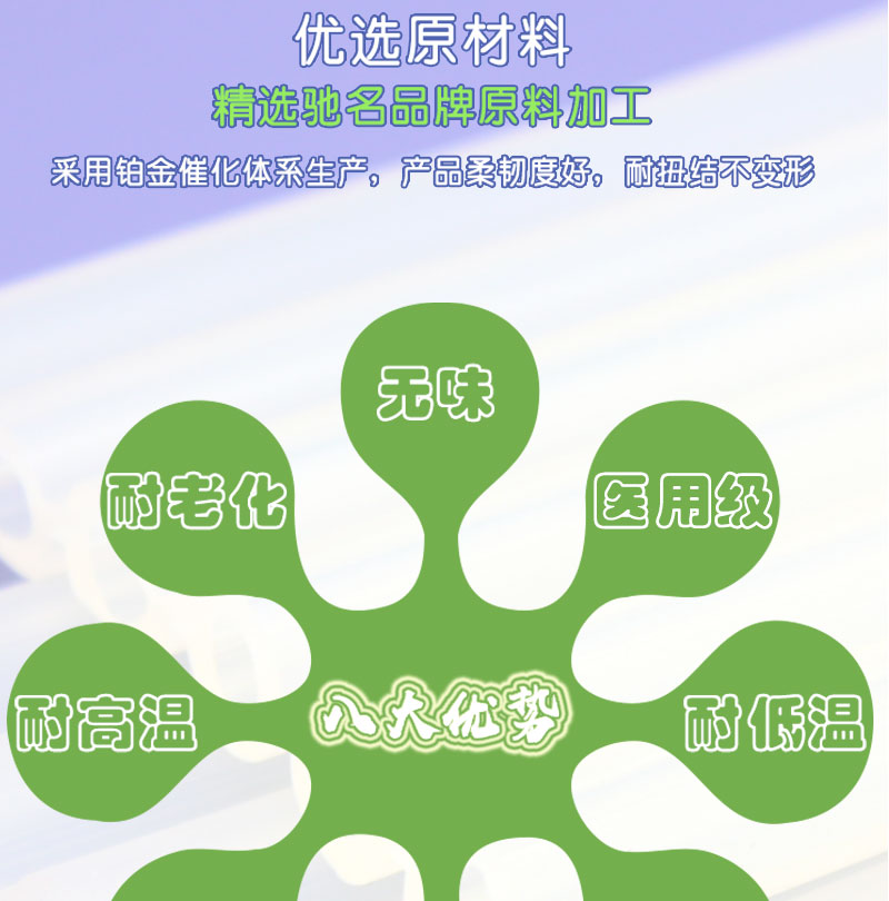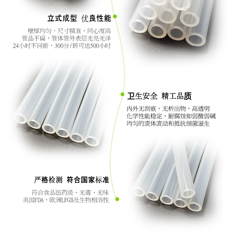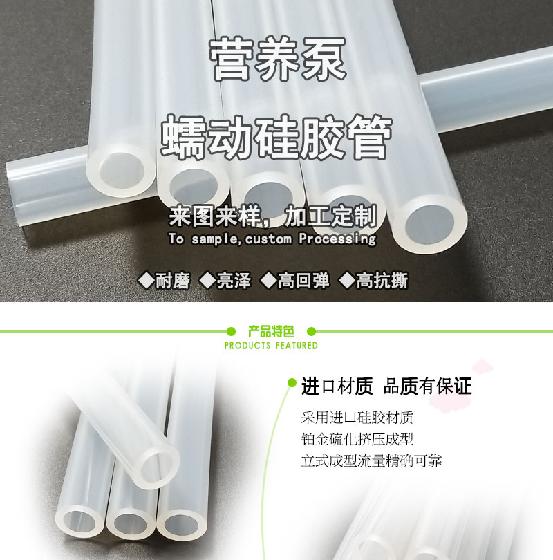 營養(yǎng)泵硅膠管:采用進(jìn)口硅膠原材料,擠出一次成型,內(nèi)壁平滑;常規(guī)硬度60度(邵氏硬度20-80度);耐溫范圍廣(-50~+260℃),可以適應(yīng)高、低溫需求,并耐老化耐磨。常規(guī)PE袋+紙箱包裝,特殊要求可按客戶標(biāo)準(zhǔn);產(chǎn)品符合SGS、FDA、LFGB、生物相溶性等;用于營養(yǎng)泵、灌裝機(jī)、醫(yī)療醫(yī)用器械、輸液泵等。