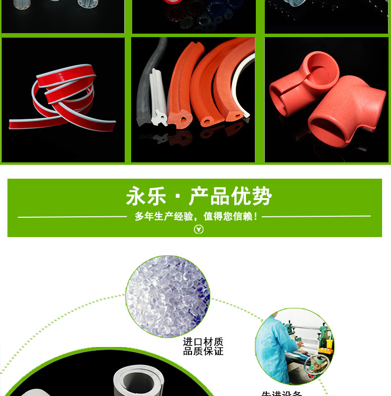 擠出硅橡膠制品廠家名稱 | 永樂橡塑 | 產(chǎn)品材質(zhì) | 硅橡膠 | 產(chǎn)品耐溫 | -50~280 |