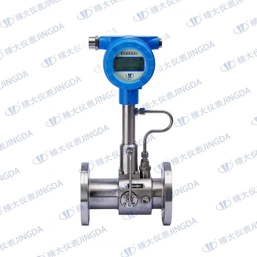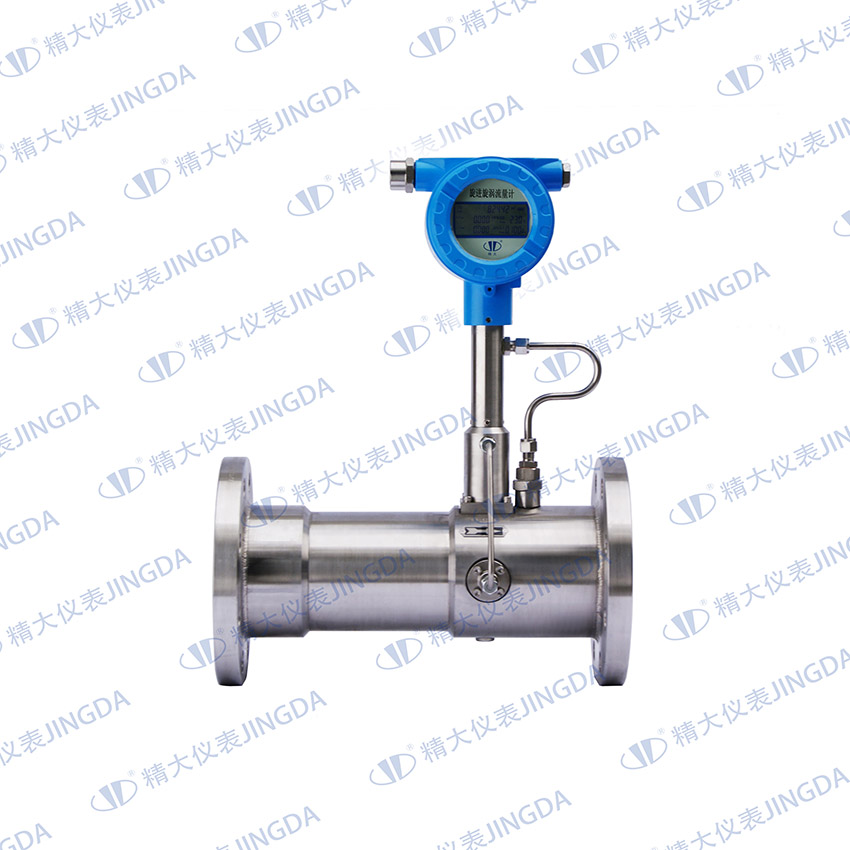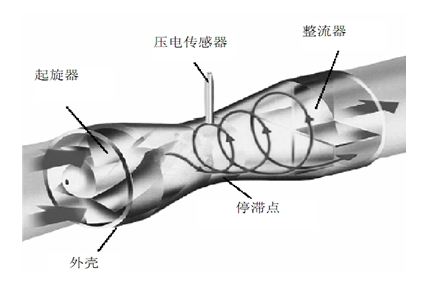 當(dāng)沿著軸向流動(dòng)的流體進(jìn)入流量計(jì)入口時(shí),螺旋形葉片強(qiáng)迫流體進(jìn)行旋轉(zhuǎn)運(yùn)動(dòng),于是在旋渦發(fā)生體中心產(chǎn)生螺旋流,旋渦流在文丘利管中旋進(jìn),到達(dá)收縮段后,因回流作用強(qiáng)迫進(jìn)行旋進(jìn)式二次旋轉(zhuǎn)。此時(shí)旋渦流的旋轉(zhuǎn)頻率與介質(zhì)流速成正比,并為線性。兩個(gè)壓電傳感器檢測(cè)的微弱電荷信號(hào)同時(shí)經(jīng)前置放大器放大、濾波、整形處理后,變成兩路頻率與流速成正比的脈沖信號(hào)進(jìn)行比較和判斷,剔除干擾信號(hào),并同固定在殼體上的溫度傳感器、壓力傳感器檢測(cè)到溫度、壓力信號(hào)一起,送入智能化積算儀進(jìn)行運(yùn)算處理,即可求得流量及相關(guān)數(shù)據(jù)。