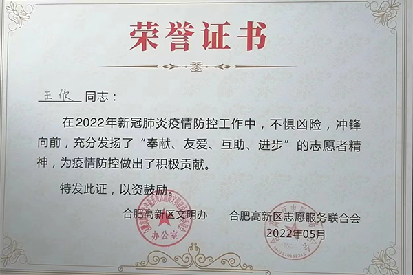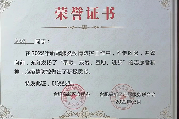 合肥精大儀表股份有限公司在新冠肺炎疫情防控工作中積極響應(yīng),組織志愿者參與到疫情防控工作中,彰顯了企業(yè)擔(dān)當(dāng),為疫情防控工作提供一份戰(zhàn)力。黨員王欣、吳淑芹二位同志在2022年新冠肺炎疫情防控工作中,不懼兇險,沖鋒向前,充分發(fā)揚了“奉獻、友愛、互助、進步”的志愿者精神,為疫情防控做了了積極的貢獻。公司和個人被高新區(qū)文明辦、和高新區(qū)志愿服務(wù)聯(lián)合會授予此榮譽證書。